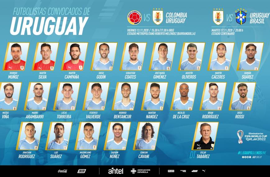 El Cuerpo Técnico de Uruguay convocó a 23 futbolistas para la doble fecha de Eliminatorias ante Colombia y Brasil. El viernes 13/11 a las 15:30 h (17:30 h Uy), Uruguay visitará a Colombia, por lo que la preparación se realizará de manera íntegra en Barranquilla.