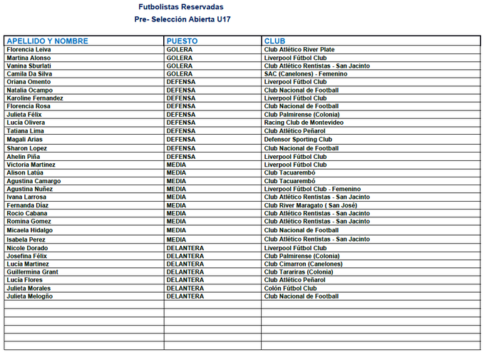 Futbolistas convocadas a la selección uruguaya femenina sub-17