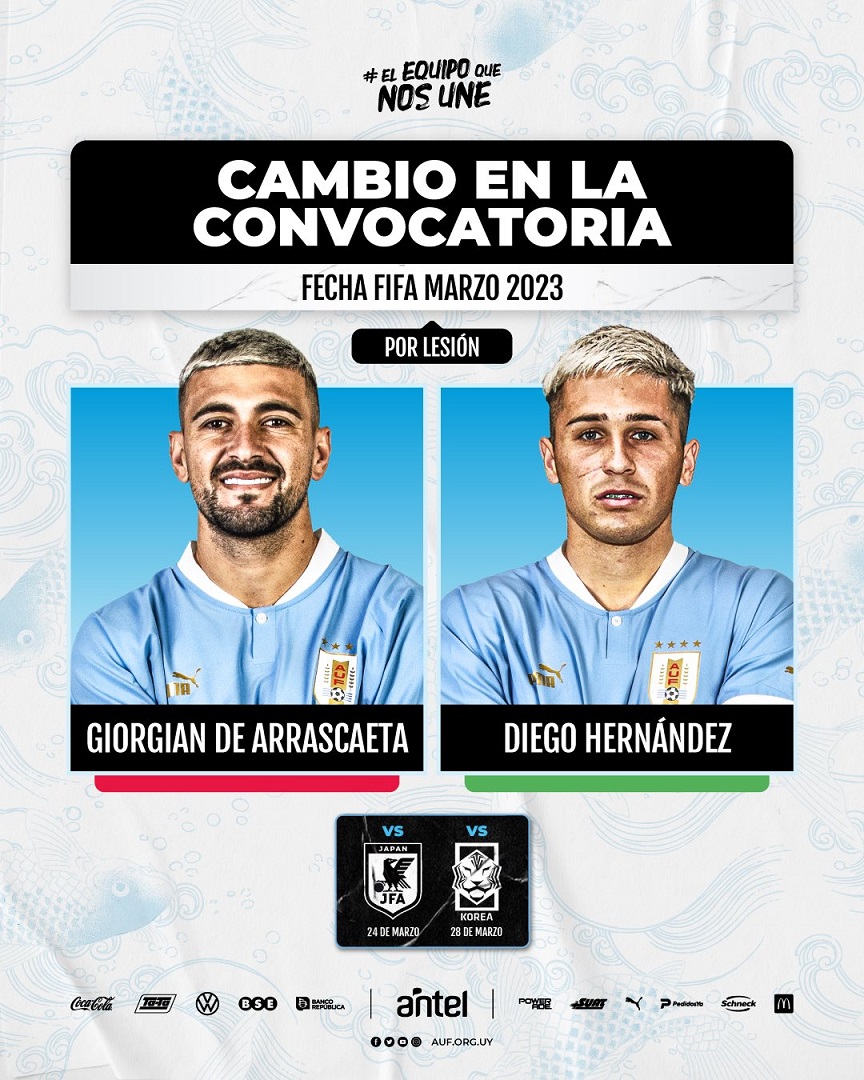 Giorgian de Arrascaeta y Ronald Araujo no participarán de la 𝐅𝐞𝐜𝐡𝐚 𝐅𝐈𝐅𝐀 por lesión y en su lugar, el director técnico interino de la selección uruguaya, Marcelo Broli, convocó a Diego Hernández y a Sebastián Cáceres.