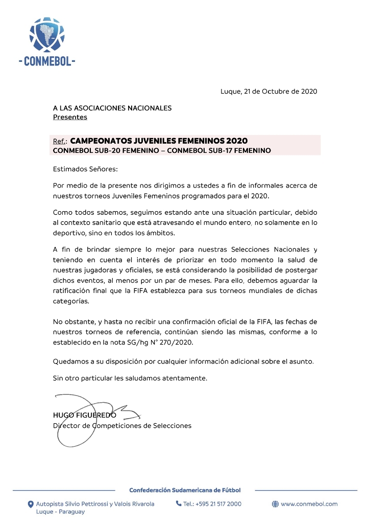 La CONMEBOL informa que por el momento se mantienen las fechas establecidas para la fase final del Sudamericano Sub-20 (16 al 22/11) y el Torneo Sudamericano Sub-17 (30/11 al 19/12).