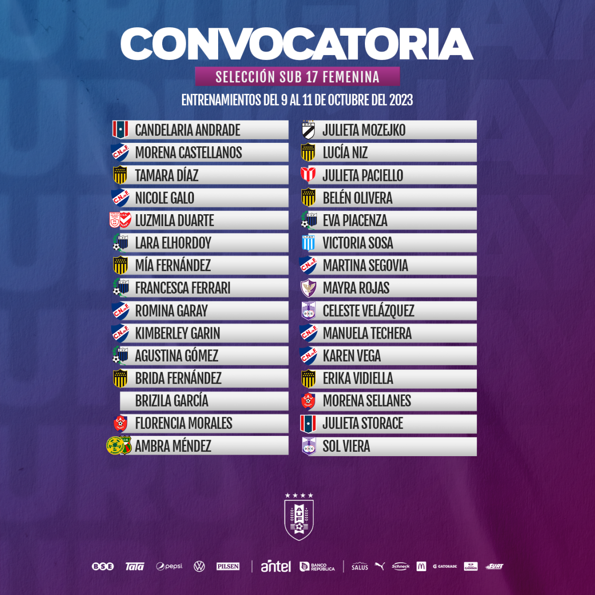 La entrenadora Stefanía Maggiolini convocó 30 jugadoras para los entrenamientos que se realizarán, del 9 al 11 de octubre, en el estadio Charrúa.