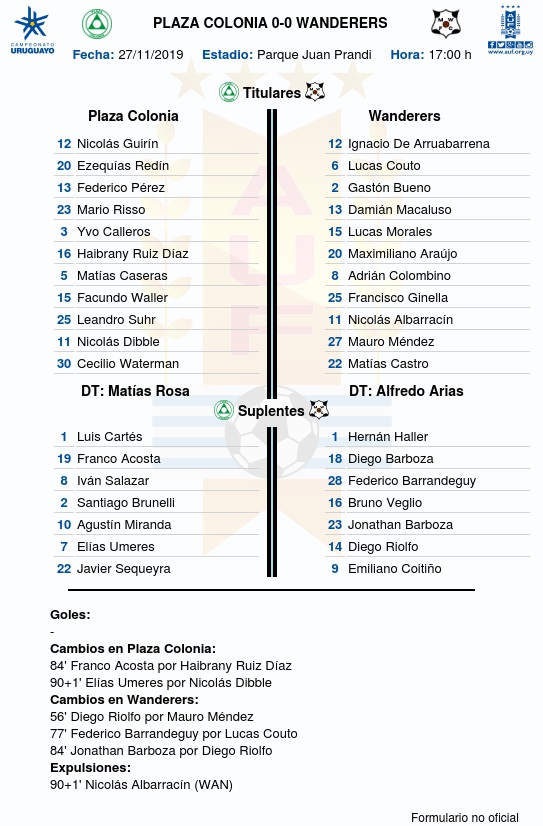 Plaza Colonia y Montevideo Wanderers igualaron sin goles en el Parque Prandi, esta tarde por la 14a fecha del Torneo Clausura 2019.