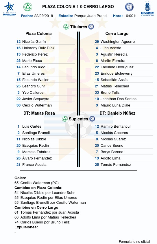 Plaza Colonia venció 1 a 0 a Cerro Largo en el Estadio Juan G. Prandi, esta tarde por la 3a fecha del Torneo Clausura 2019.
