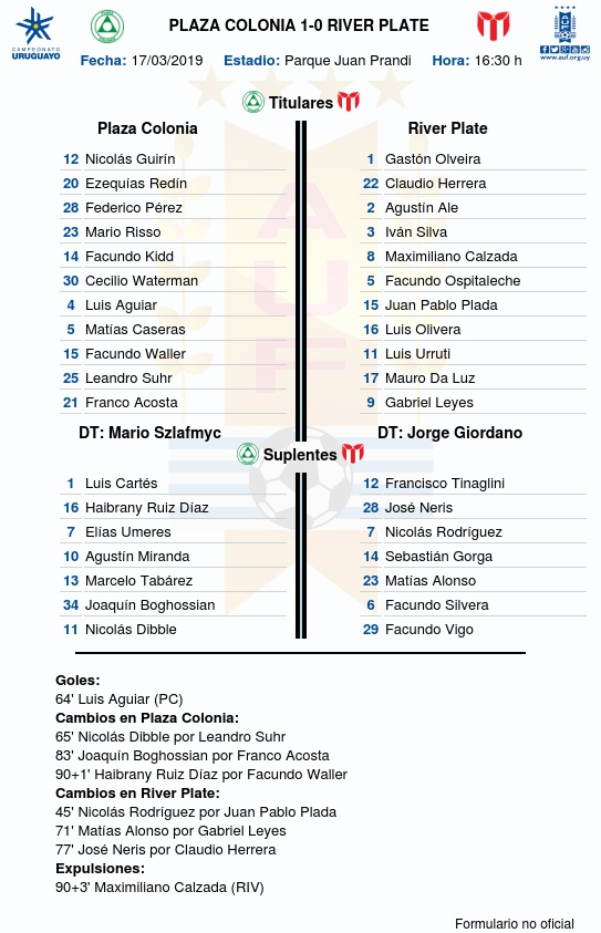 Plaza Colonia venció 1 a 0 a River Plate, con gol de Luis Aguiar, este domingo (17/3) de tarde en el Parque Juan Prandi por la 5ª fecha del Torneo Apertura 2019.