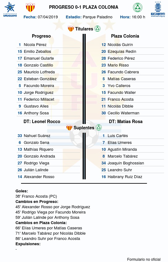 Plaza Colonia venció a Progreso por 1 a 0, con gol de Franco Acosta, este domingo (7/4) de tarde en el Parque Paladino por la 8ª fecha del Torneo Apertura 2019.