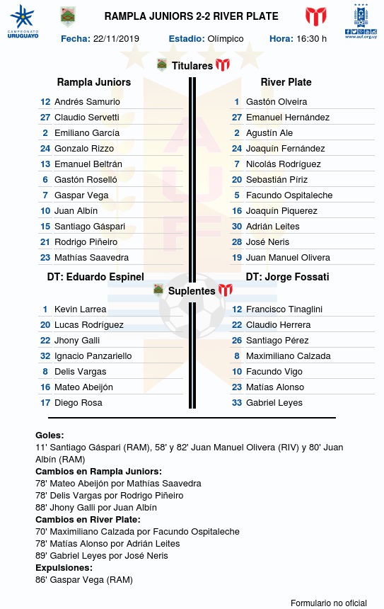 Rampla Juniors y River Plate empataron 2 a 2 en el estadio Olímpico, esta tarde por la 13a fecha del Torneo Clausura 2019.