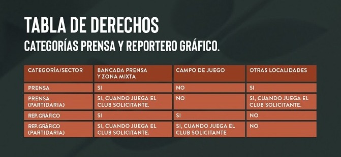 - Los derechos de acceso indicados en la tabla anterior no serán aplicables a encuentros oficiales de Selección Mayor y pueden ser modificados en casos de eventos de asistencia masiva con la debida notificación previa. En esos casos, se abrirá un nuevo proceso de acreditación.