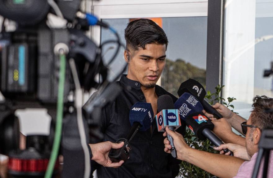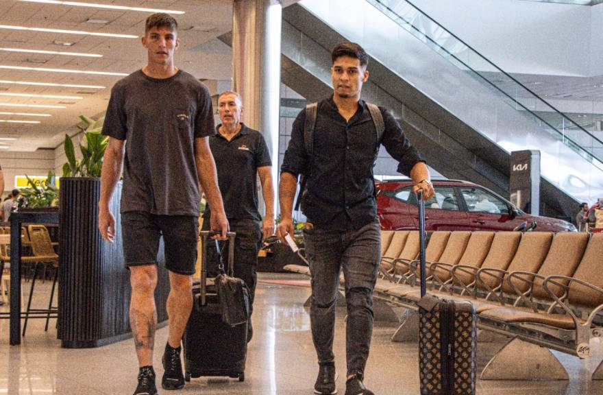 Antes de partir, ambos futbolistas compartieron un espacio de diálogo con los medios de comunicación apostados en el ingreso de la Sala VIP del Aeropuerto Internacional de Carrasco.