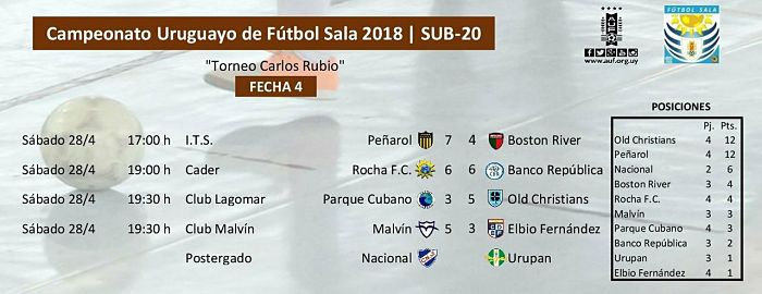 Se disputó el sábado de manera íntegra la 4ª fecha del Torneo Apertura sub-20 con cuatro partidos en escenarios de Montevideo, Canelones y Rocha, en donde Old Christians y Peñarol son líderes. Nacional – Urupan quedó postergado por participación del conjunto albo en Copa Libertadores.