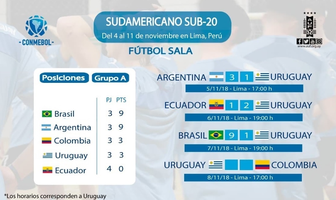 Uruguay perdió 9-1 ante Brasil en el Polideportivo de la Federación Peruana por la 4ª jornada del Grupo A del Sudamericano sub-20 que se desarrolla en la ciudad de Lima, Perú.