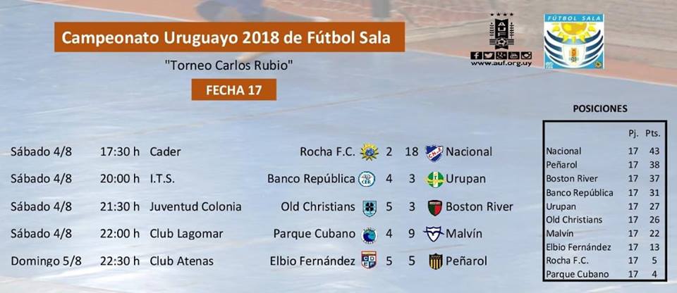 Nacional venció 18-2 a Rocha F.C. en el gimnasio Cader con goles de Matías Daguerre x4, Facundo Abad x4, Leandro Ataídes x3, Joaquín Varietti x3, Gabriel Palleiro x2, Sebastián Prunell y 1 en contra. En tanto, Axel Romaso e Ignacio Díaz marcaron para los locales.