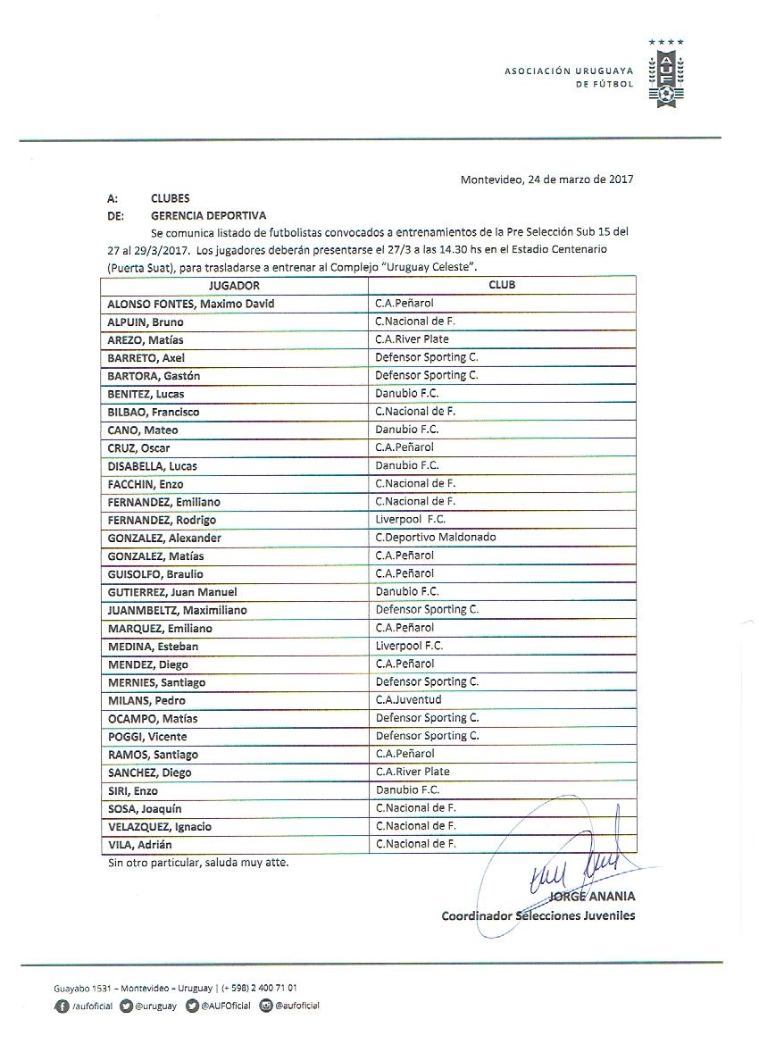 Futbolistas convocados de la selección uruguaya sub-15