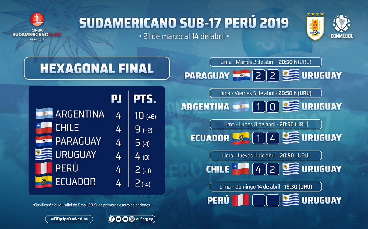 De acuerdo al fixture, la Celeste jugará el próximo domingo 14 de abril en la quinta fecha de la Fase Final rumbo al Mundial de Brasil 2019 ante Perú a las 18:30 h de Uruguay. A este torneo clasificarán las primeras 4 selecciones. También jugarán a segunda hora Paraguay - Chile y a última Argentina - Ecuador.